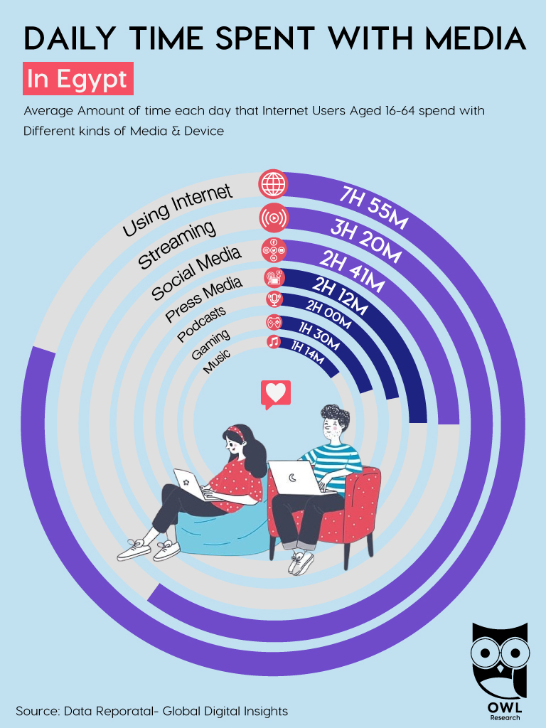 The digital landscape in Egypt has witnessed significant growth in recent years, with internet users increasingly relying on multiple forms of media. According to Data Reportal – Global Digital Insights, Egyptians aged 16–64 spend an average of 7 hours and 55 minutes online every day, highlighting the central role of digital platforms in daily life.