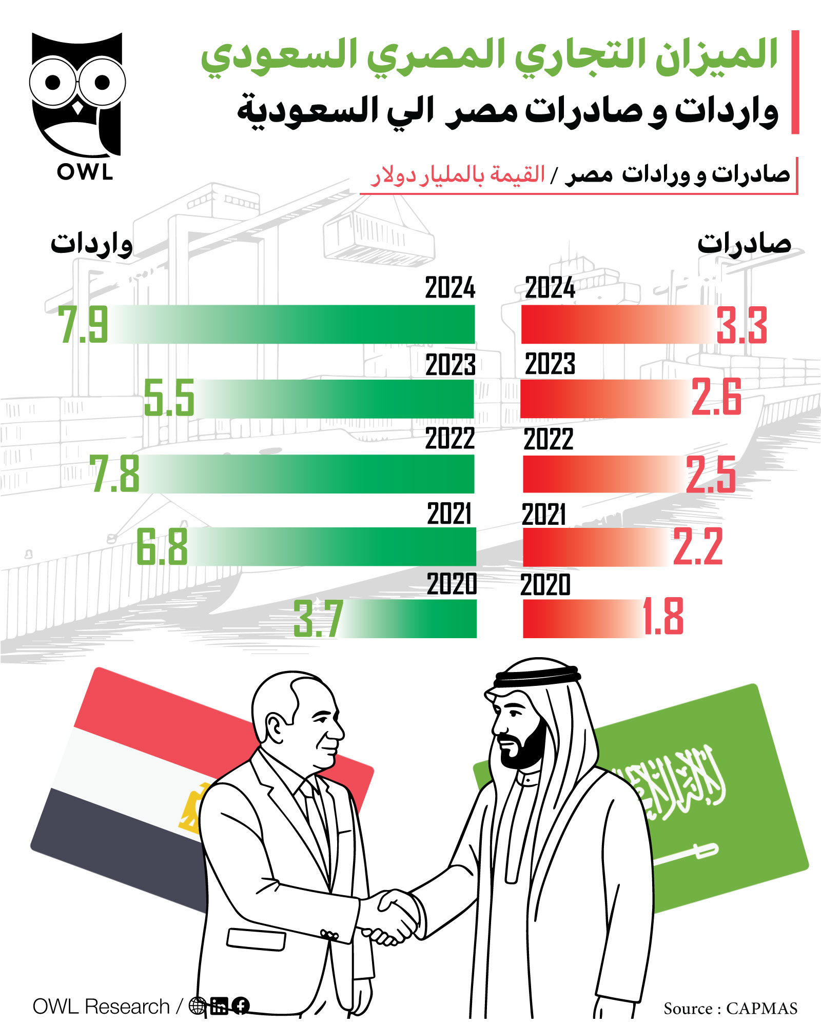 Trade relations between Egypt and Saudi Arabia represent one of the strongest bilateral economic ties in the Middle East. According to data from CAPMAS, trade flows between the two countries have grown significantly in recent years, though Egypt continues to run a trade deficit with the Kingdom.