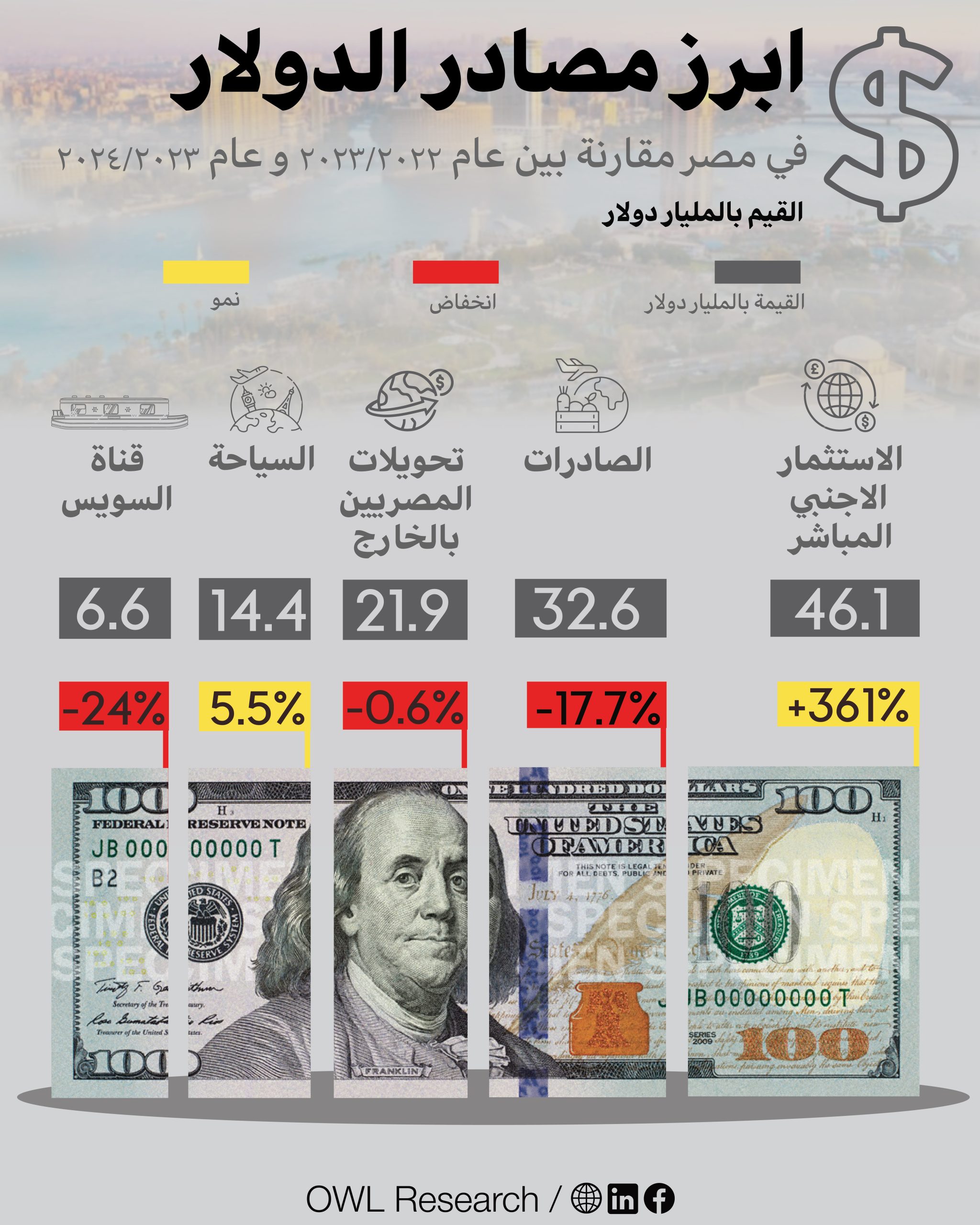 A recent comparative analysis highlights significant changes in Egypt’s primary sources of vital foreign currency (USD) between the 2023/2022 and 2024/2025 fiscal periods. The data reveals a story of sharp volatility, steep declines in traditional pillars, and the dramatic rise of one key sector.