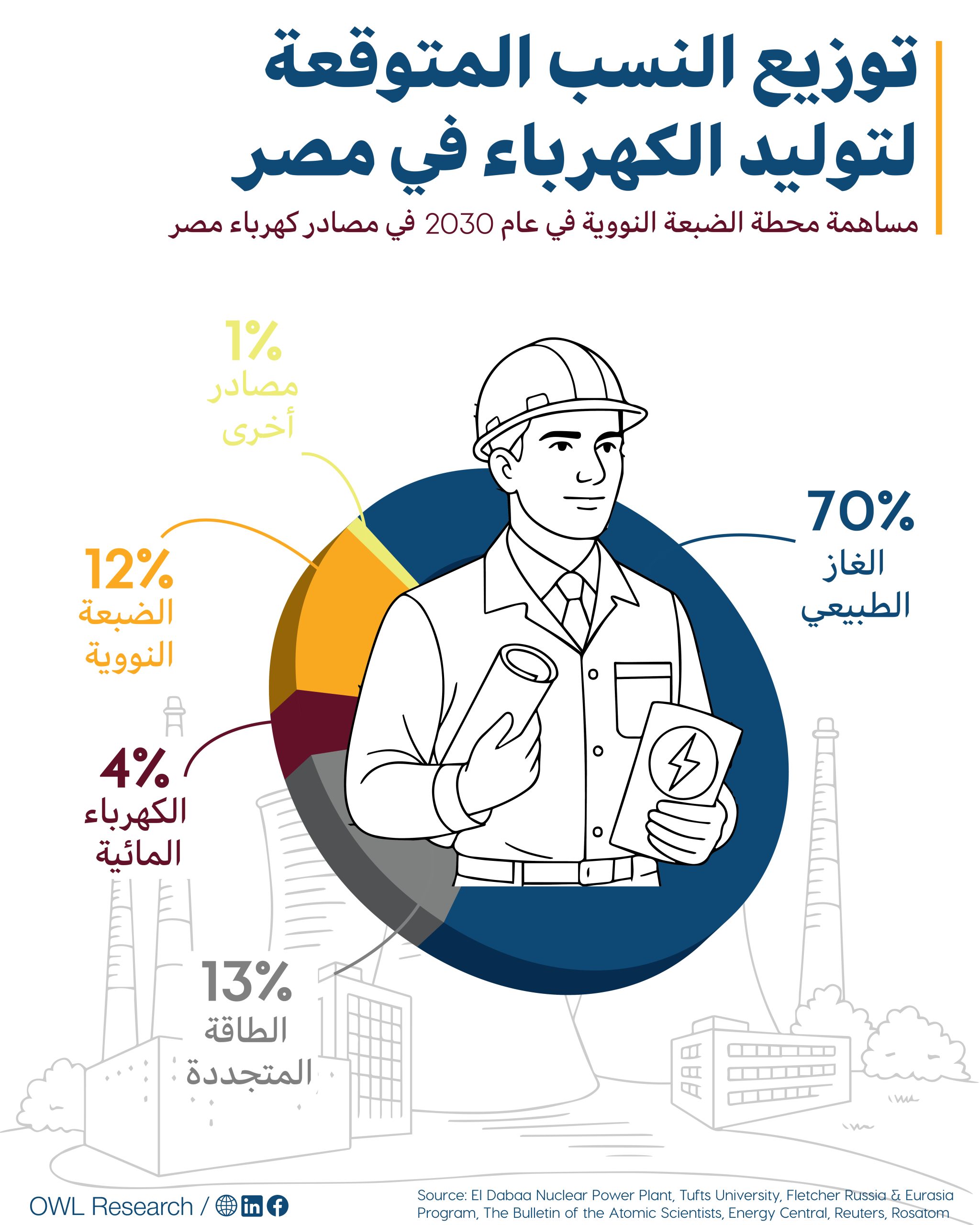According to projections for Egypt’s electricity generation mix in 2030, the El Dabaa plant is expected to supply approximately 12% of the nation’s total electricity. It will operate alongside other energy sources, with renewable energy (such as solar and wind) contributing around 13%, hydropower at 4%, and natural gas remaining the dominant source at 70%. Another 1% will come from other sources.