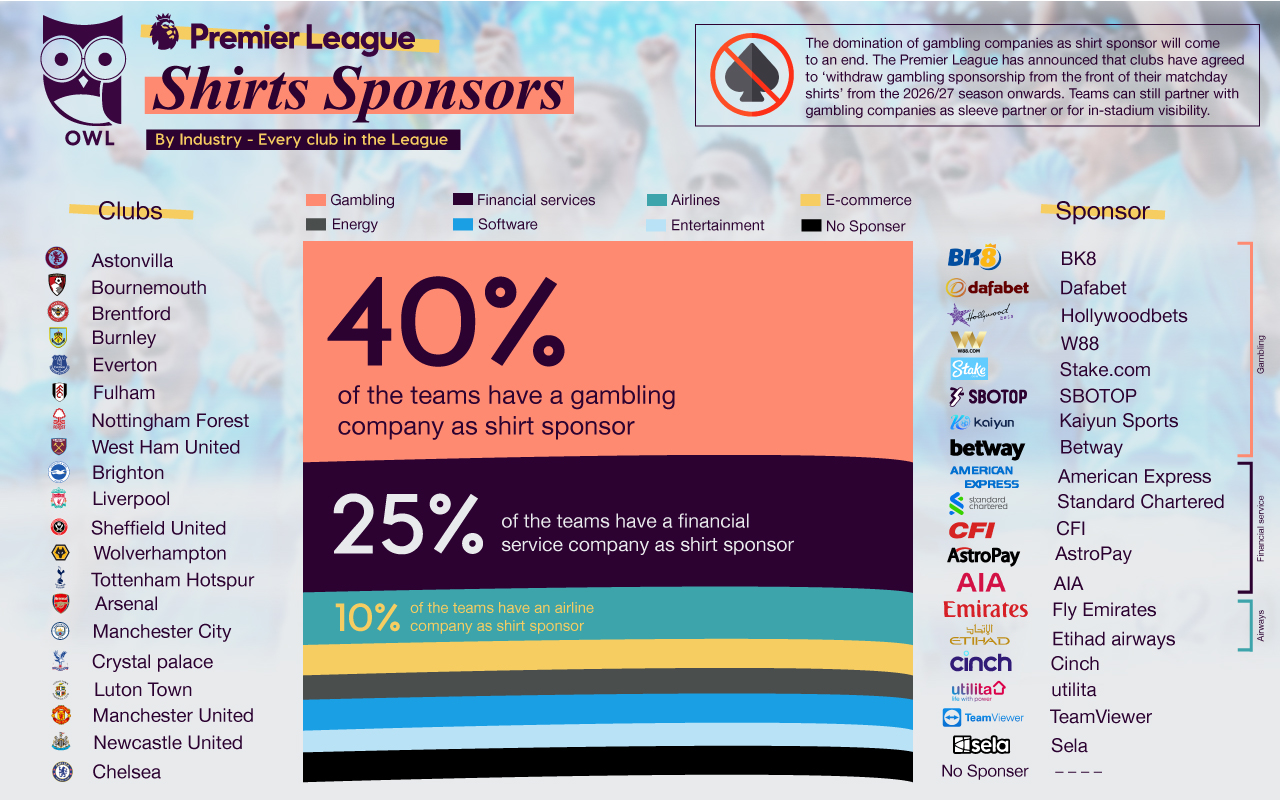- Regulatory changes ahead: From 2026-27, the Premier League will ban gambling companies as front-shirt sponsors. Versus