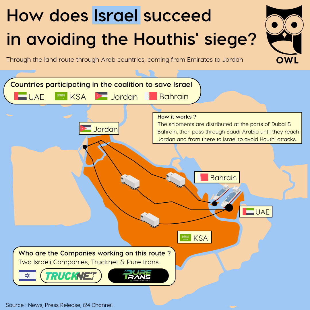 Since the escalation of Houthi attacks on shipping lanes in the Red Sea, global trade has been forced to find alternative routes to maintain the flow of goods. Israel, in particular, has been under direct pressure as Houthi forces declared Israeli-linked vessels as legitimate targets. To overcome this, Israel has leaned on a land corridor through Arab countries, creating a strategic bypass that keeps supply chains running.