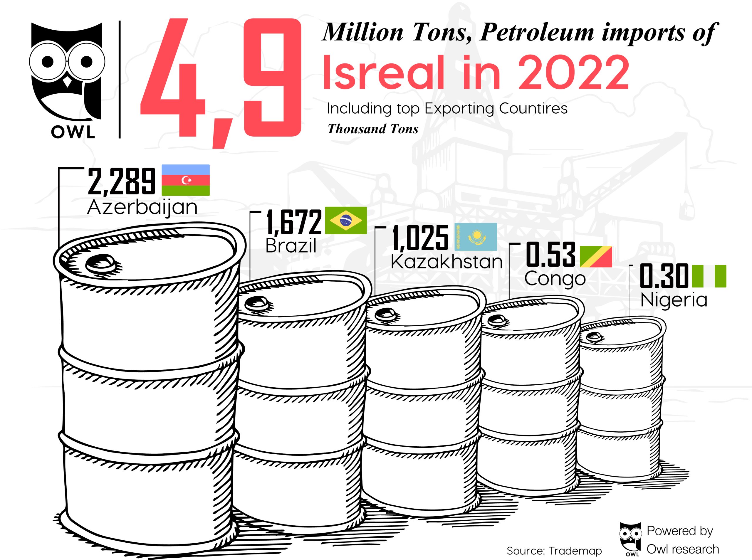 In 2022, Israel imported around 4.9 million tons of petroleum, with a handful of countries making up the majority of its supply. According to Trademap data, the leading exporters to Israel were Azerbaijan, Brazil, and Kazakhstan, with smaller contributions from Congo and Nigeria.