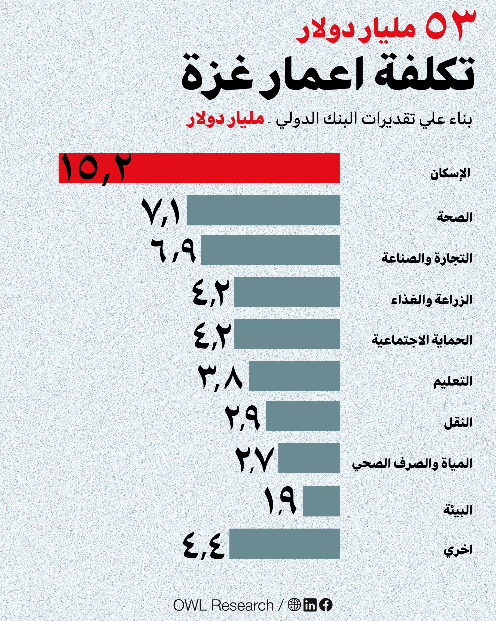 Rebuilding Gaza after years of destruction is not a short-term project — it is a decade-long effort that requires massive resources and international commitment. According to the estimates shown in the report, Gaza will need around $53 billion over ten years to restore essential services and infrastructure across the Strip.