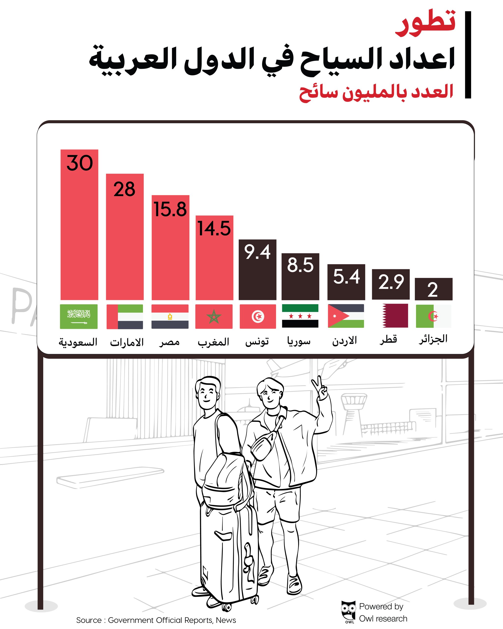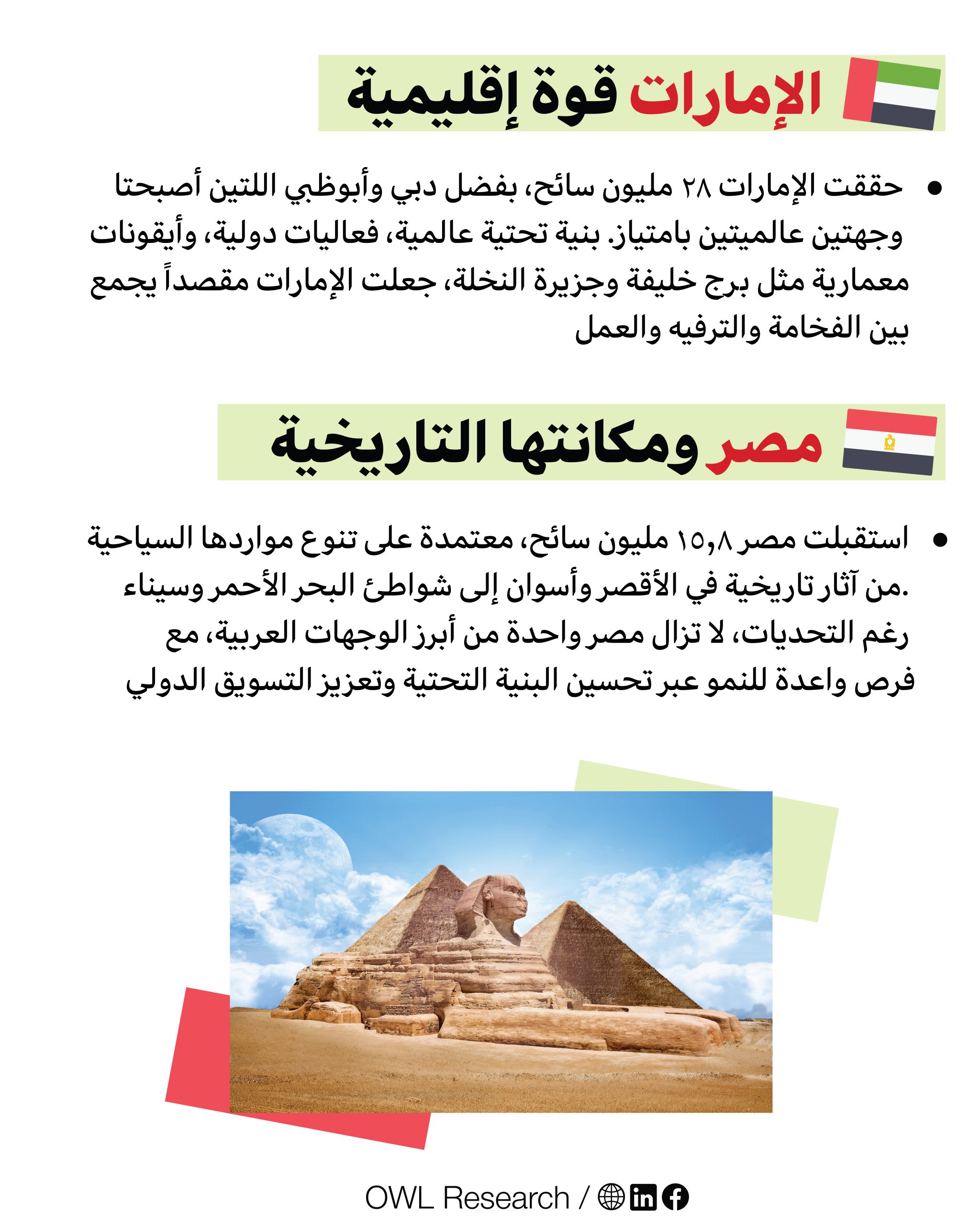 Saudi Arabia tops the Arab tourism rankings with 30 million visitors. Under Vision 2030, the Kingdom expanded its tourism offerings beyond religious travel to include cultural, entertainment, and luxury destinations. Events like Riyadh Season and Jeddah Season attracted millions, while continuous inflows of pilgrims further strengthened its tourism numbers.