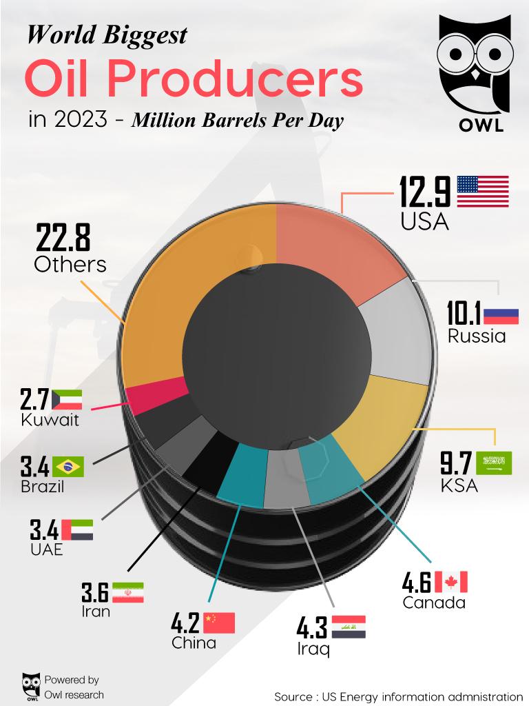 The United States remained the largest oil producer in 2023, producing 12.9 million barrels per day. Its dominance is largely due to shale oil and technological advancements in hydraulic fracturing, making it less dependent on imports and turning it into a net energy exporter.